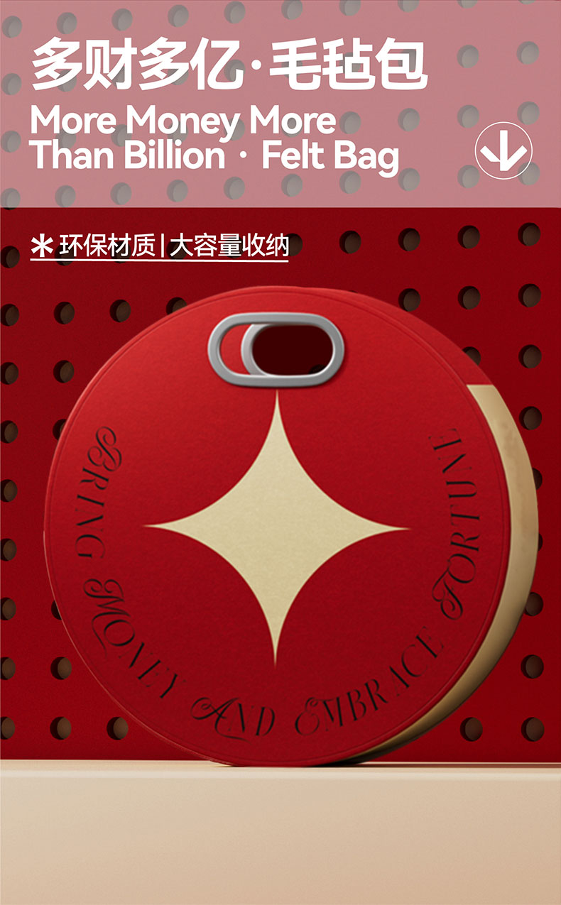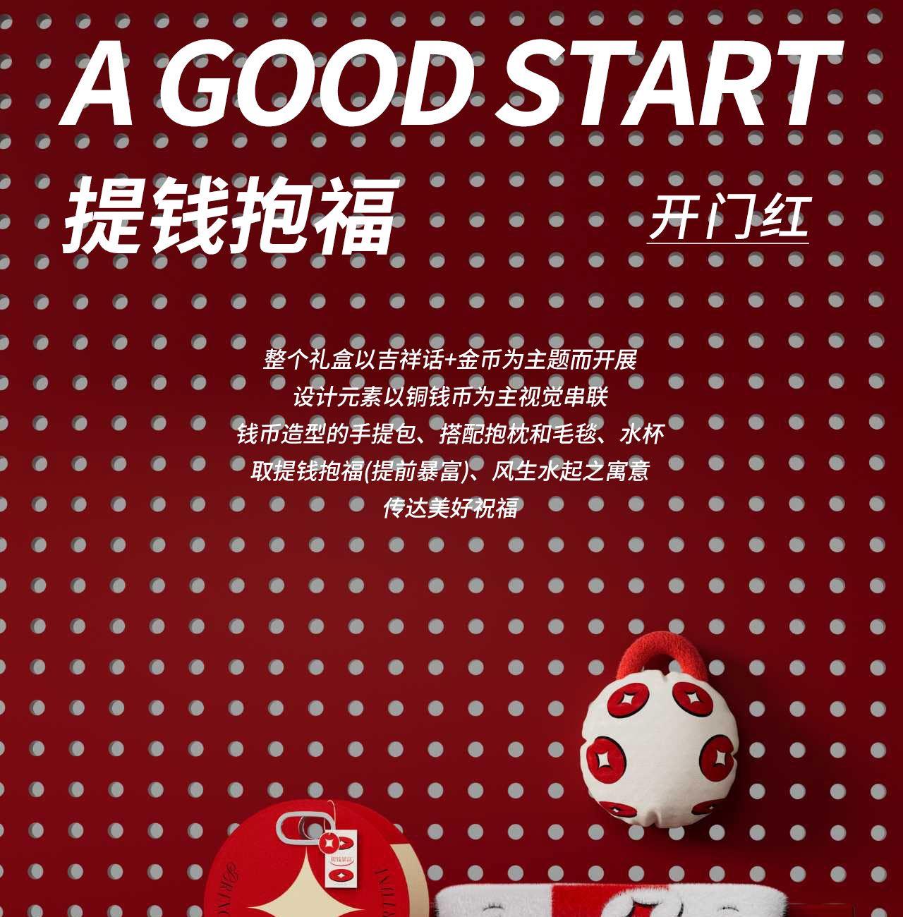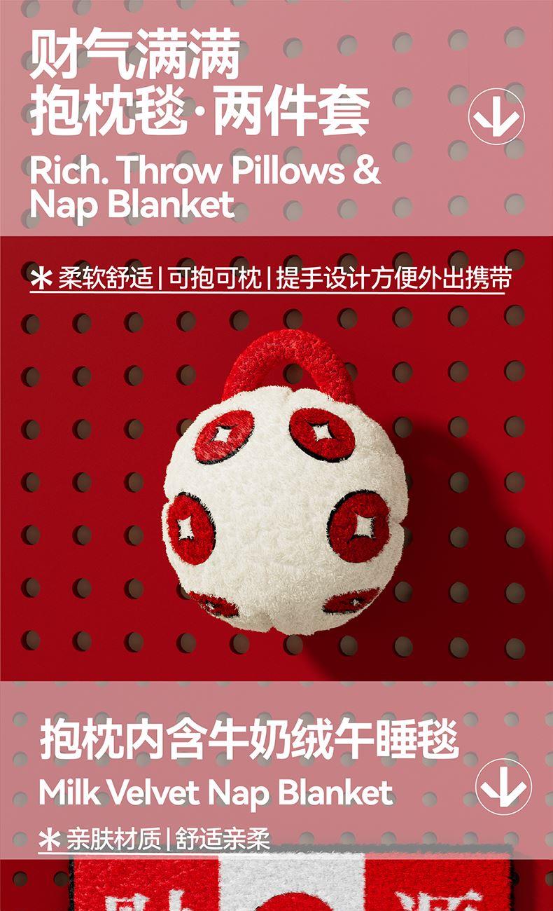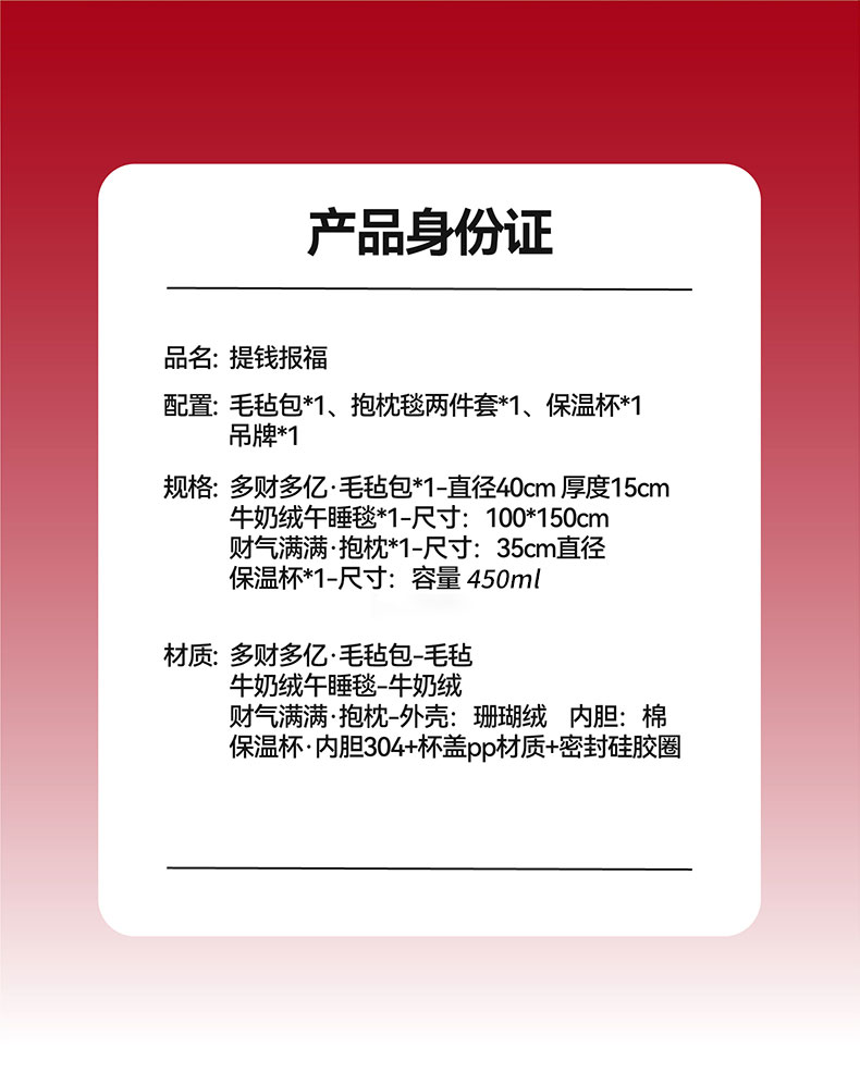 整个礼盒以吉祥话+金币为主题而开展 设计元素以铜钱币为主视觉串联 钱币造型的手提包、搭配抱枕和毛毯、水杯 取提钱抱福(提前暴富)、风生水起之寓意 传达美好祝福 内配:毛毡包*1、创意抱枕毯二合一*1 弹扣保温杯*1