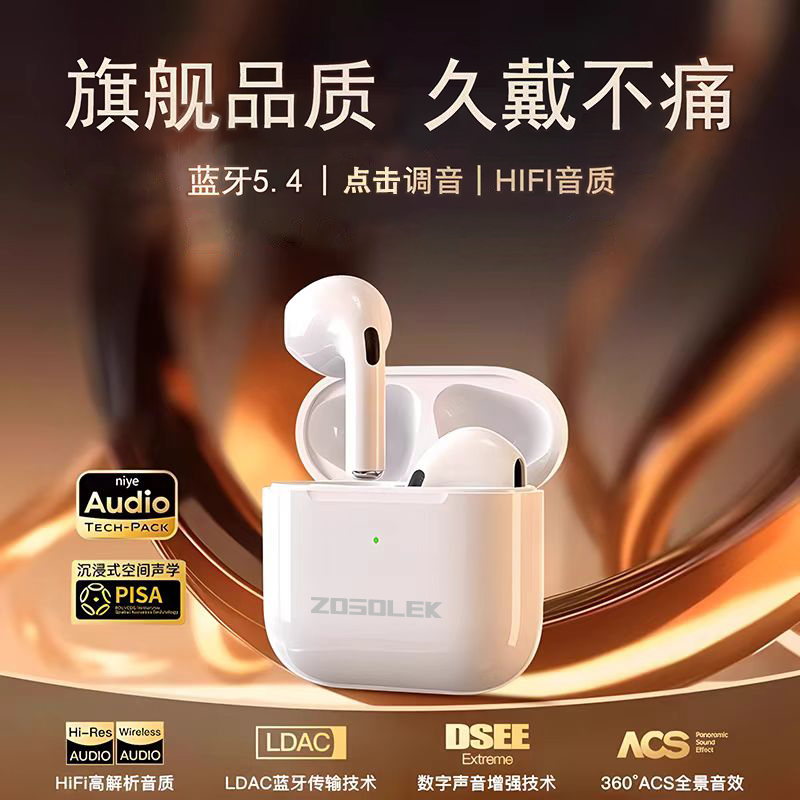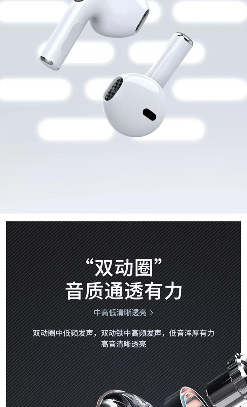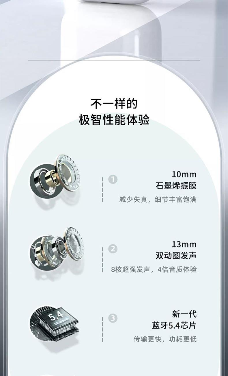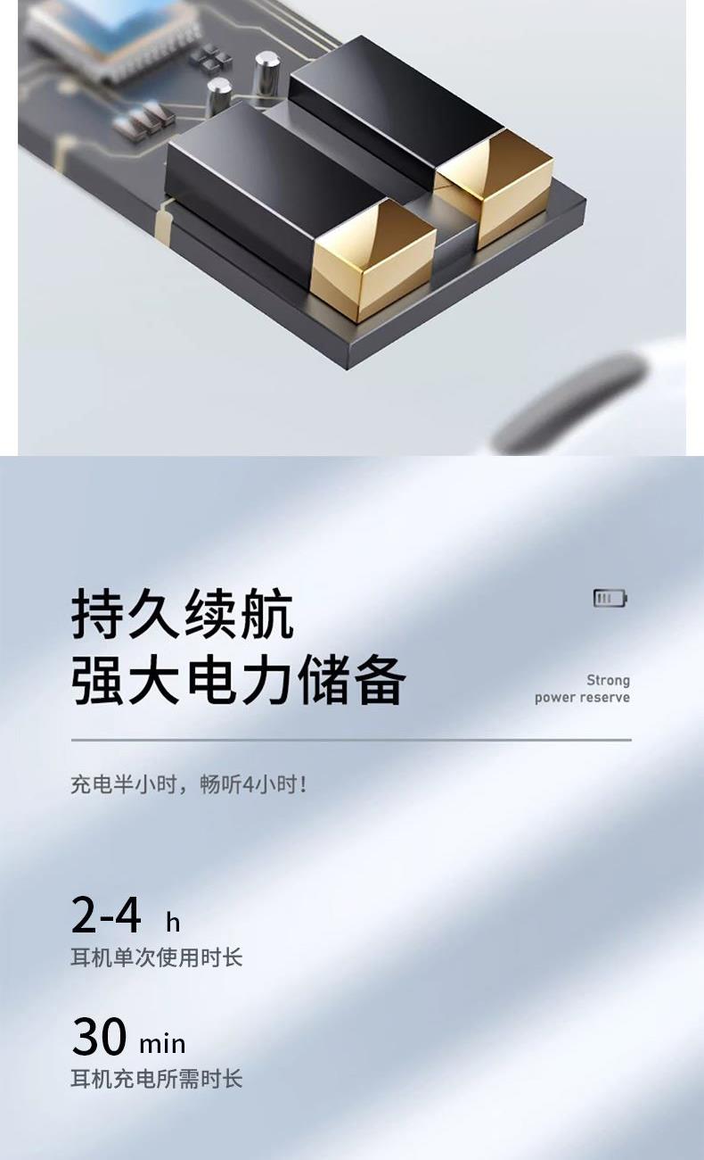 通话时长:2-4小时 播放时间:2-4小时产品特点:1、精致小巧、佩戴舒适、携带方便;2、德国专业调音团队,无限调试,适合每一双挑剔的耳朵;3、低功耗DSP抗干扰Bluetooth5.4芯片,连接顺畅不卡顿;4、ACC+SBC音频解码,无感延迟,音画同步;5、石墨烯振膜,减少失真,双动圈发声,畅享中高低音HIFI音效;6、安全高标准锂电池,续航更持久;7、生活防水,防水防汗,无惧风雨;8、礼盒包装,支持定制。