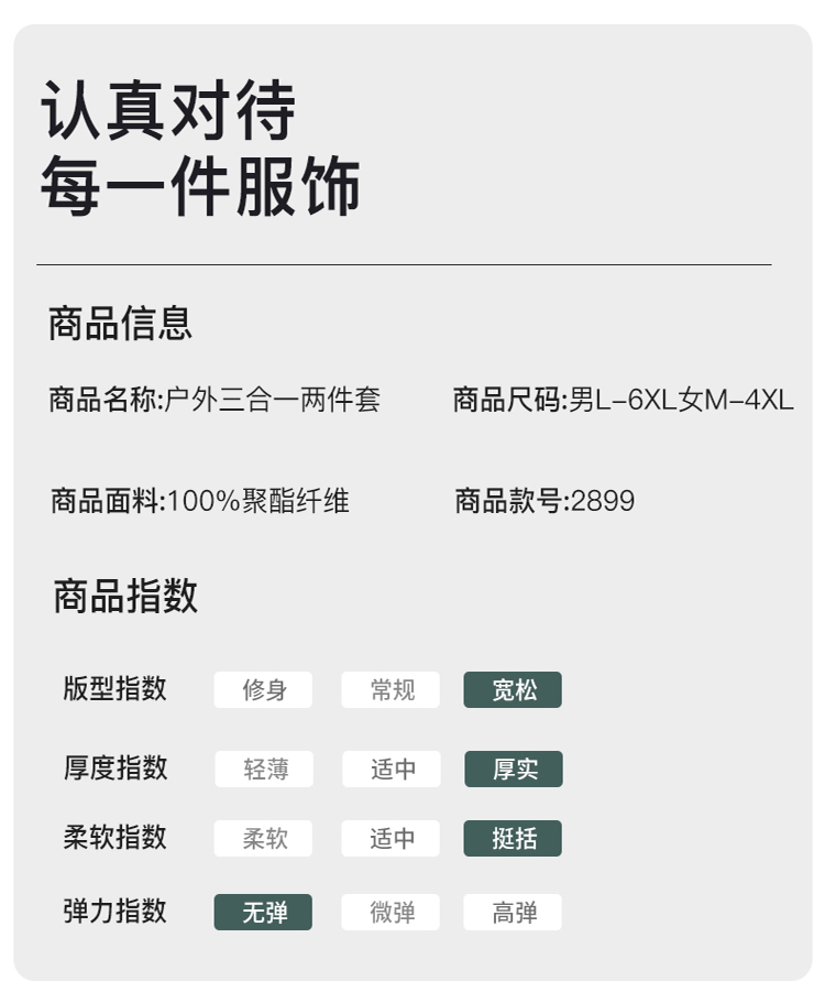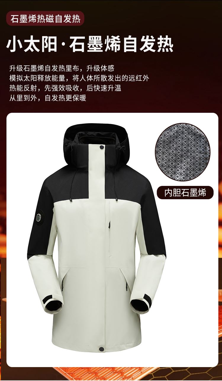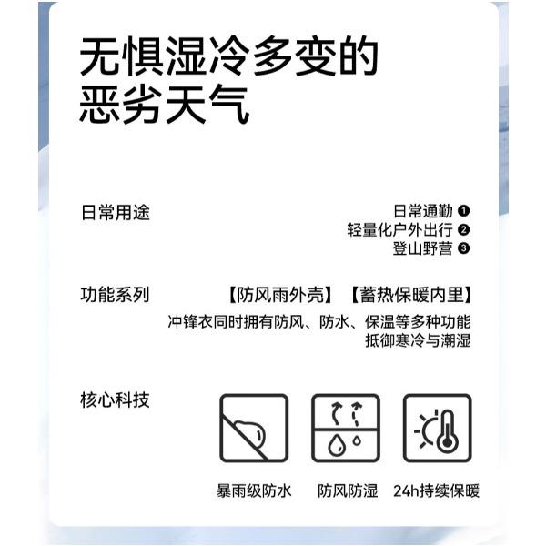 》面料:石墨烯科技面料 》功能:多功能性 》面料成分:聚酯纤维 》颜色:11色 》尺码:M-4XL 》里料成分:聚酯纤维 》内胆成分:聚酯纤维 》版型:分男女款 卖点说明: 采用立体压胶技术 防暴风雨抗脏耐脏 日常打理轻松循环透气 干爽不闷热高克重抓绒内胆 保暖舒适石墨烯循环导热 蓄温保暖