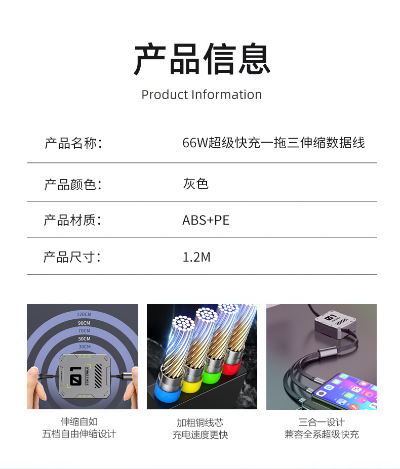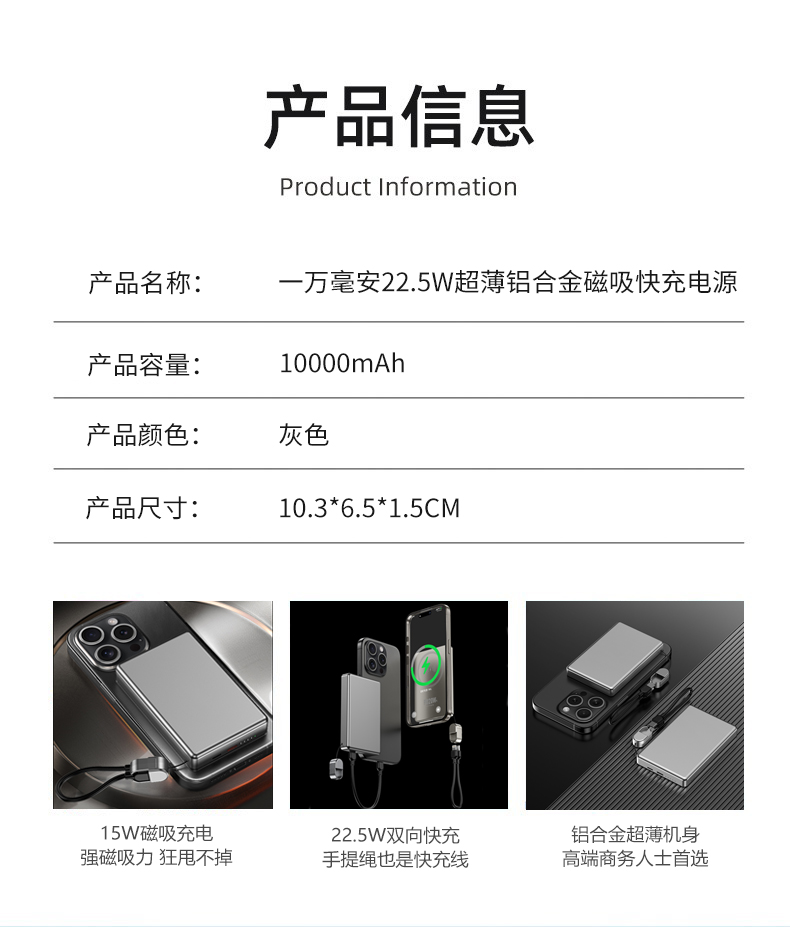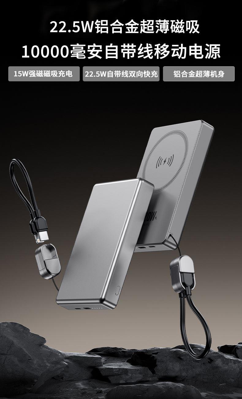 1、一万毫安22.5W超薄磁吸铝合金快充电源 22.5W双向超级快充,15W磁吸无线充 铝合金超薄机身,双向快充提绳设计 3C符合民航局标准,可随身携带 2、66W超级快充一拖三伸缩数据线 兼容苹果15系列 五档伸缩调节 1.2米长度设计 TPE材质经久耐用 三种充电接口满足各种手机