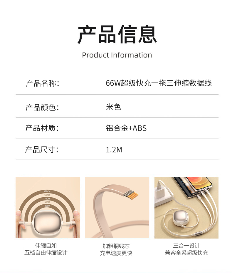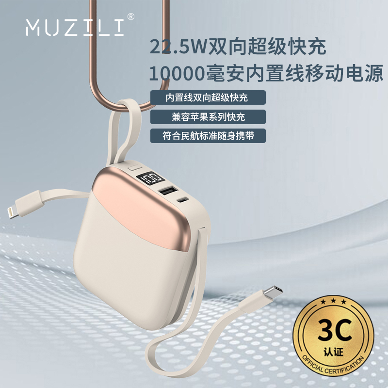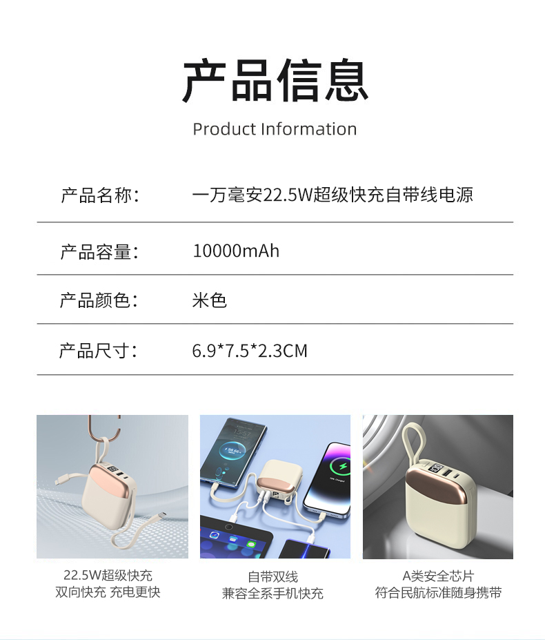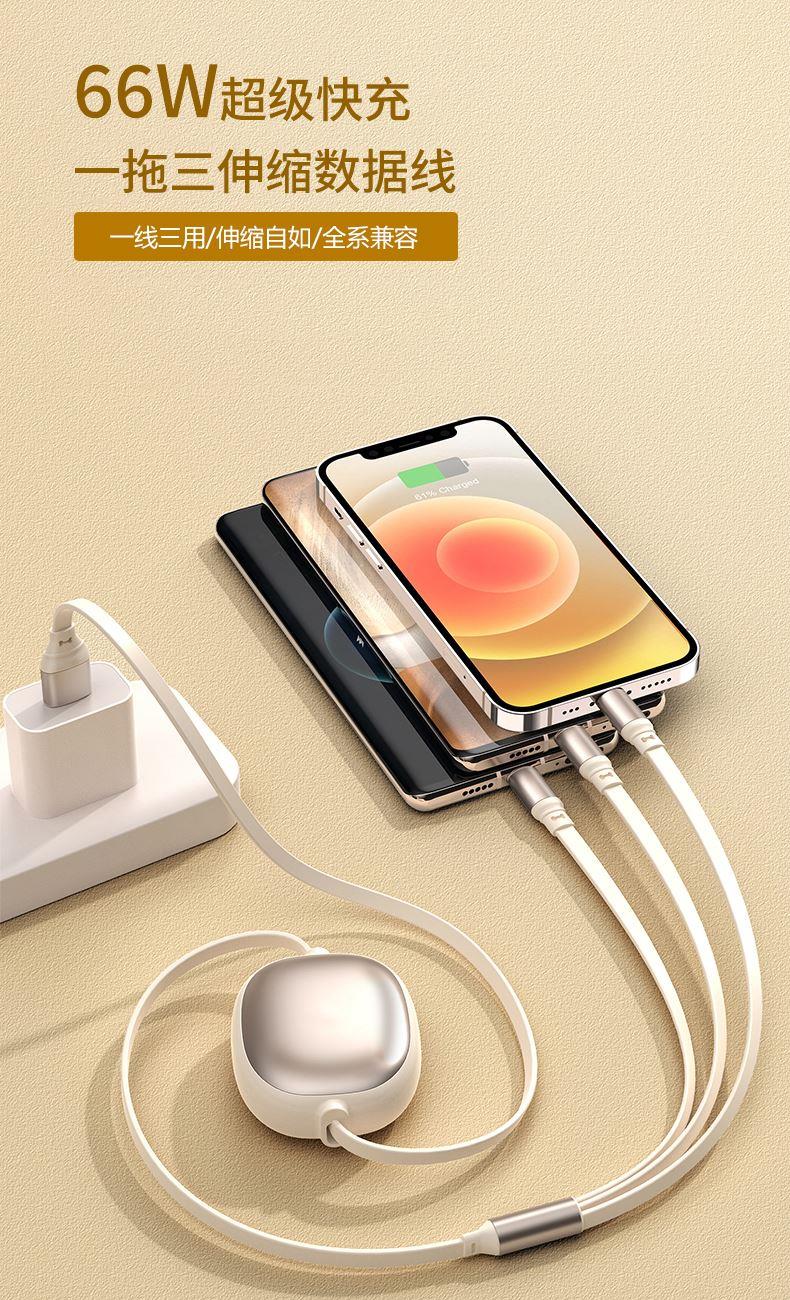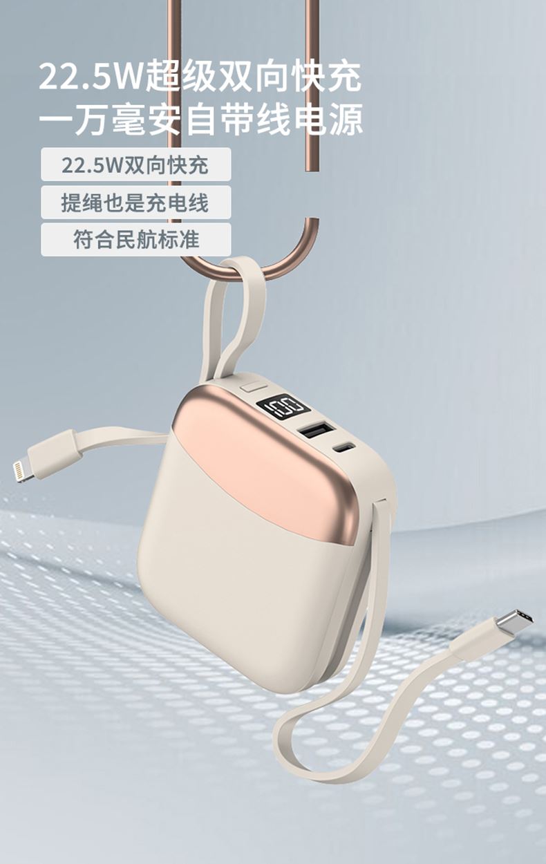 1、一万毫安22.5W超级快充内置线移动电源 22.5W超级快充,自带双线 数字电量显示 3C符合民航局标准,可随身携带 2、66W铝合金超级快充一拖三伸缩数据线 兼容苹果15系列 五档伸缩调节 1.2米长度设计 铝合金面盖 三种充电接口满足各种手机