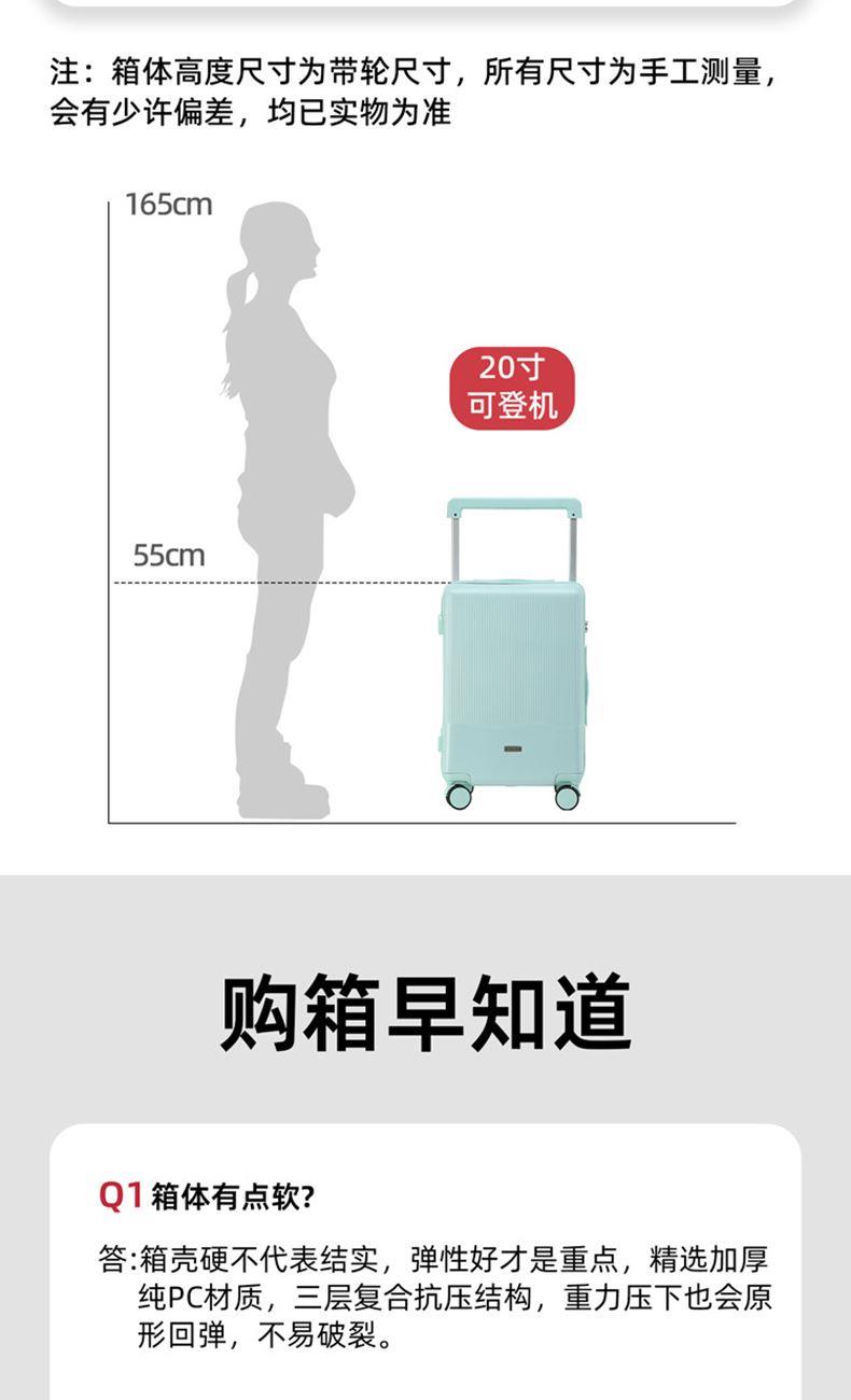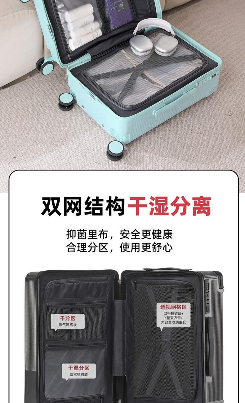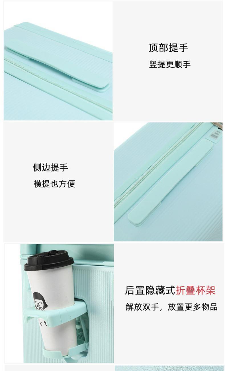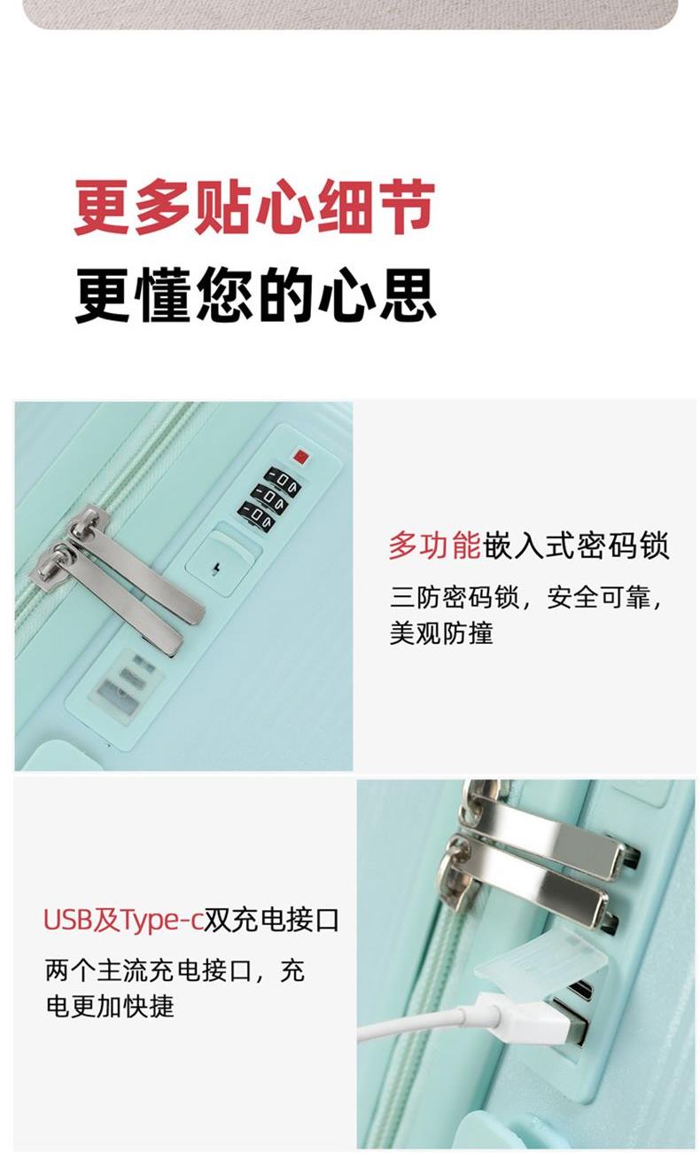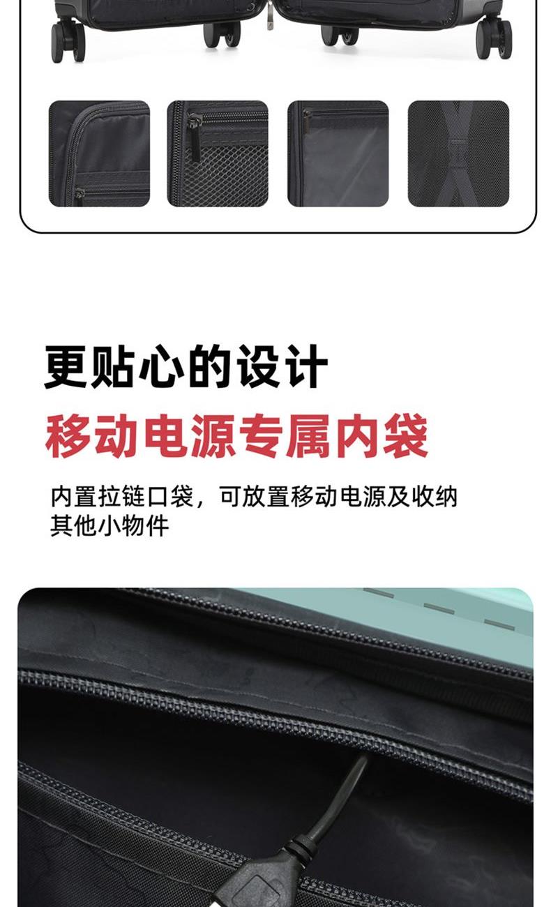 1、新款隐藏式宽体设计,配置拉满,内空间比传统拉杆箱更大更平整;2、带顶部和侧部提手,竖提横提都方便;3、侧部4个顶脚带方便行李挂架功能;4、底部带4个承重防磨顶脚,取放行李无惧剐蹭箱体;5、内里大双网结构,干湿分离,分区合理;6、带USB及Type-C充电口,同时配置移动电源内袋;7、带多功能可折叠隐藏式杯架;8、加厚PC箱体外壳,防刮坚固耐磨;9、 耐用合金拉杆,舒适手提,稳固顺滑;10、三码安全密码锁,防爆拉链,一路旅途安全放心;11、 TPE万向静音飞机轮,高承重,肆意而行。