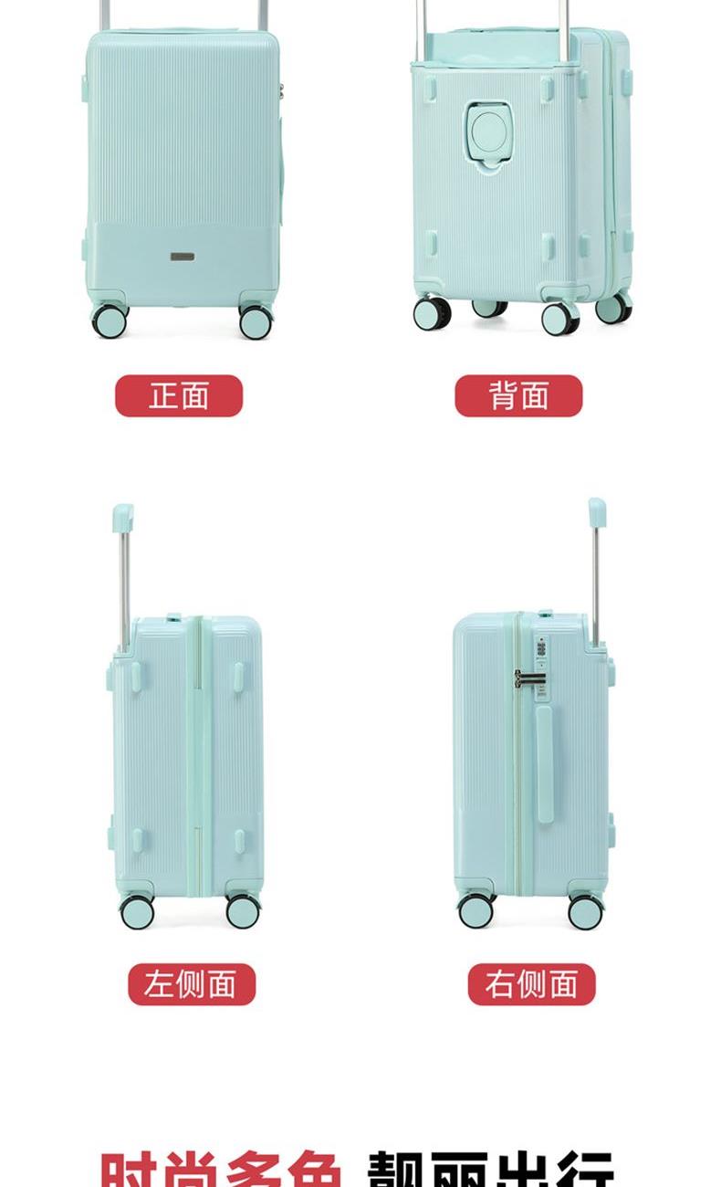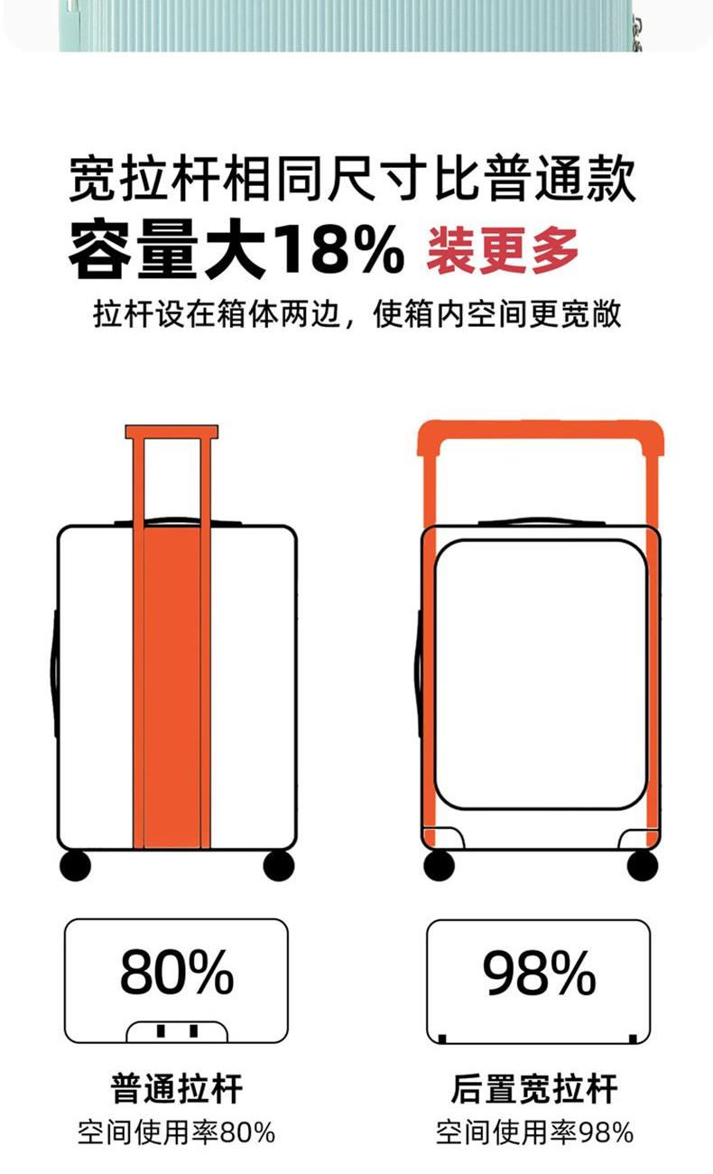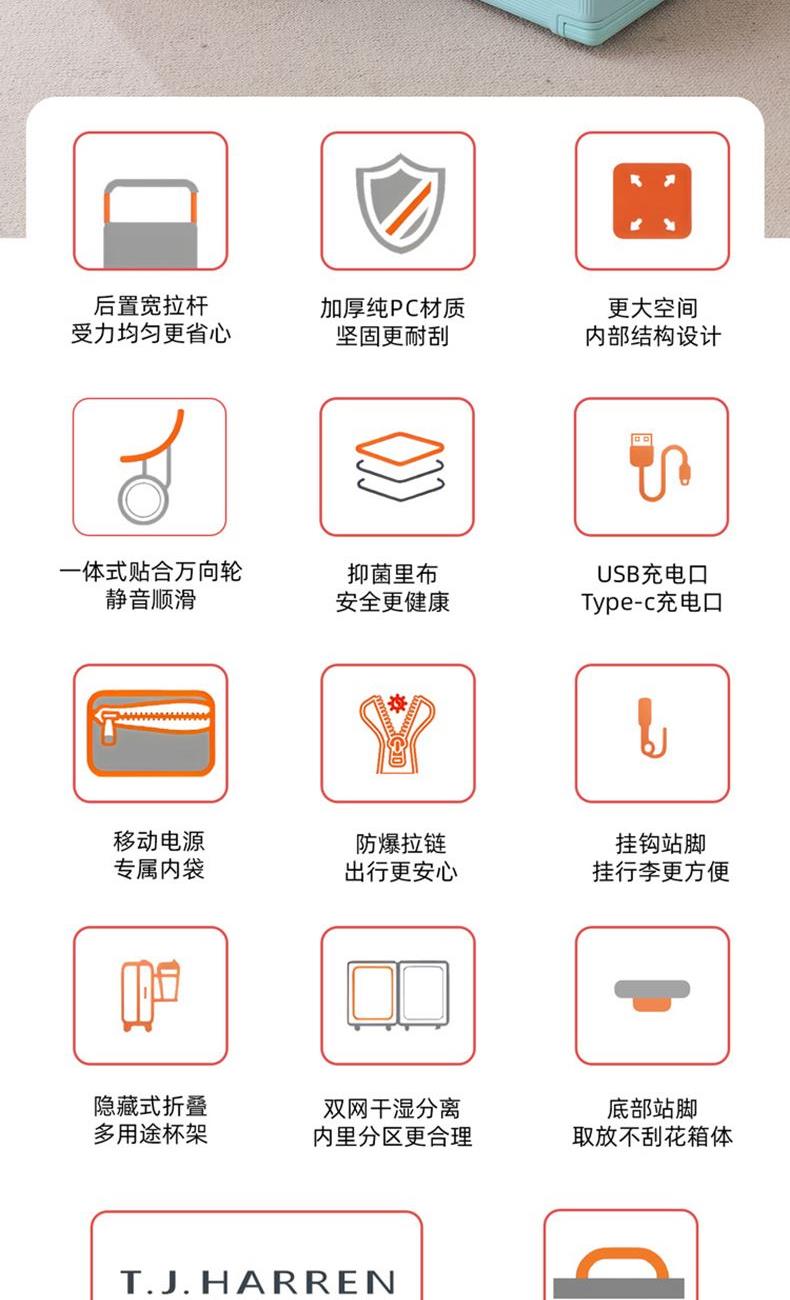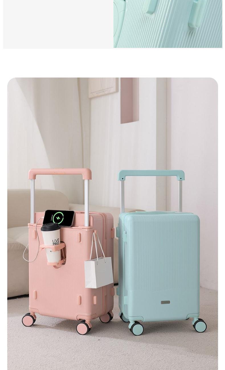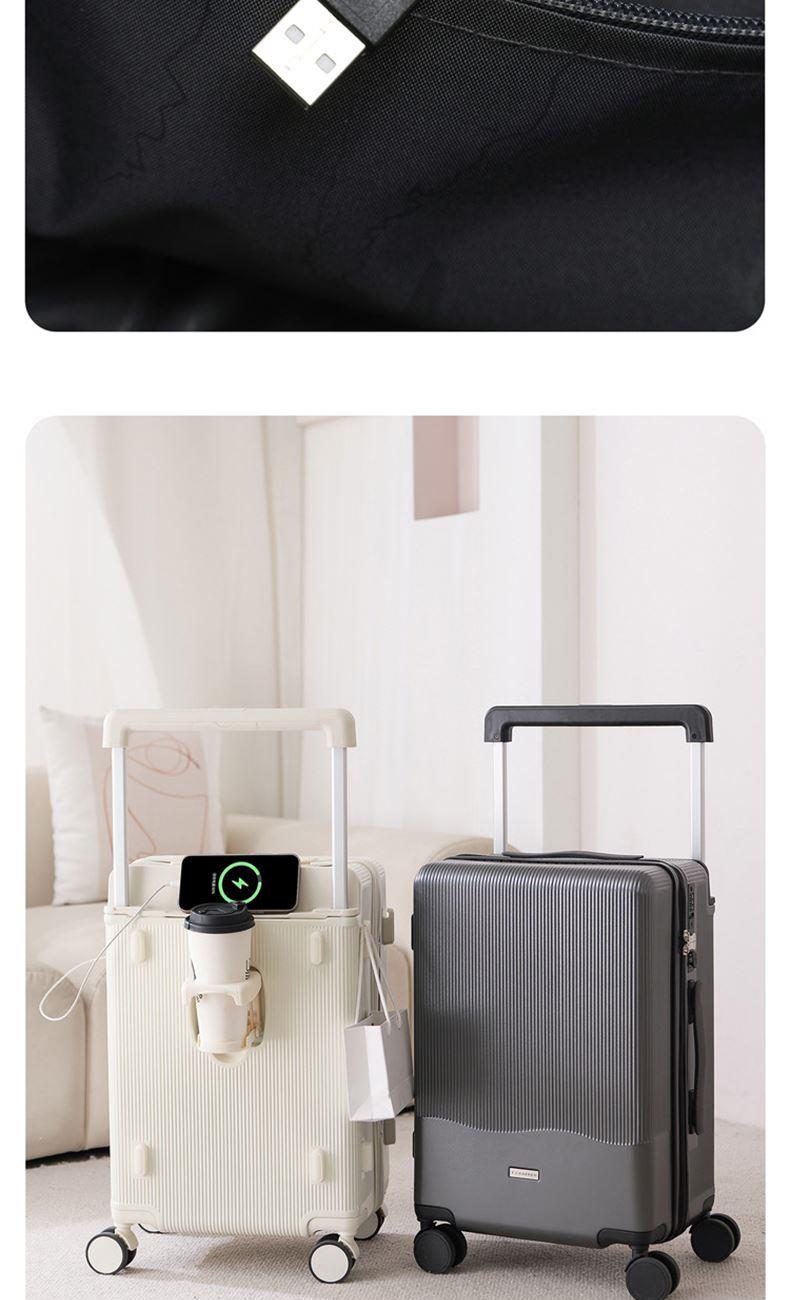 1、新款隐藏式宽体设计,配置拉满,内空间比传统拉杆箱更大更平整;2、带顶部和侧部提手,竖提横提都方便;3、侧部4个顶脚带方便行李挂架功能;4、底部带4个承重防磨顶脚,取放行李无惧剐蹭箱体;5、内里大双网结构,干湿分离,分区合理;6、带USB及Type-C充电口,同时配置移动电源内袋;7、带多功能可折叠隐藏式杯架;8、加厚PC箱体外壳,防刮坚固耐磨;9、 耐用合金拉杆,舒适手提,稳固顺滑;10、三码安全密码锁,防爆拉链,一路旅途安全放心;11、 TPE万向静音飞机轮,高承重,肆意而行。