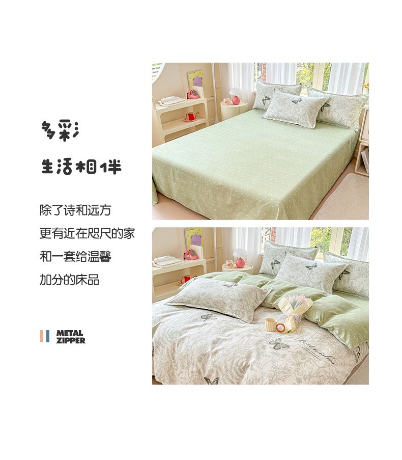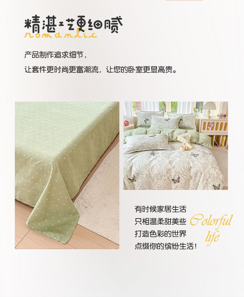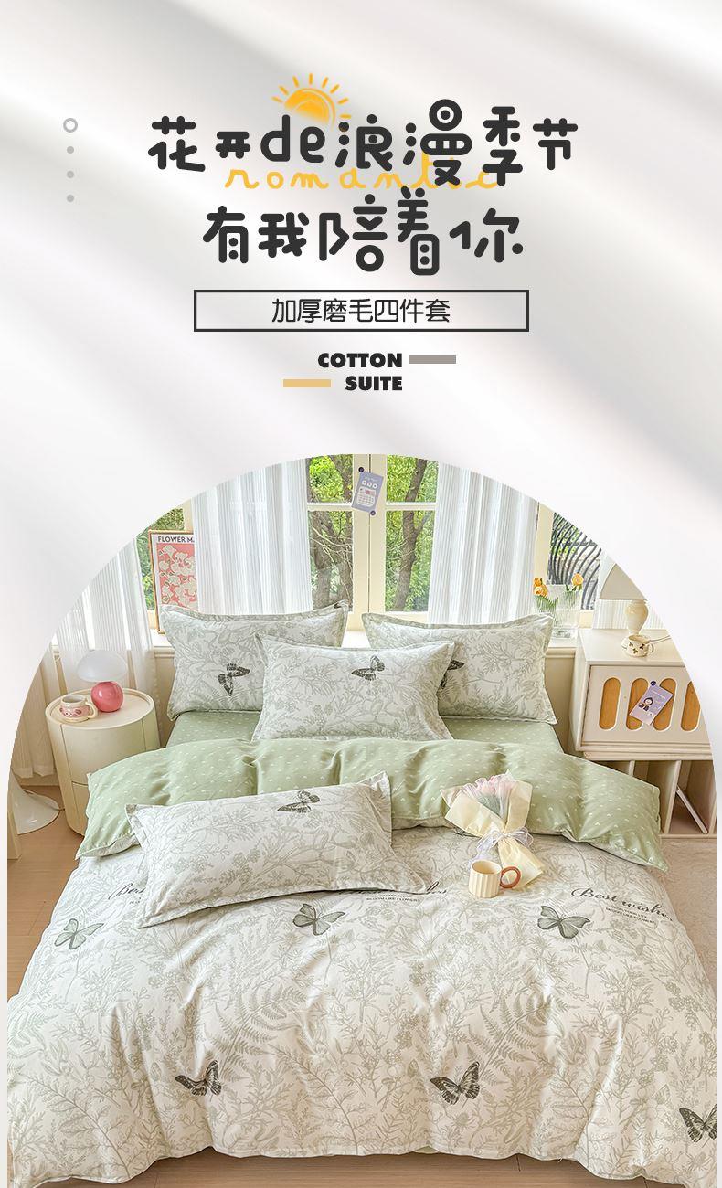 被套:200×230cm 床单:230×230cm 枕套:48×74cm 适用:1.5M-1.8M床 面料:磨绒(聚酯纤维) 印染工艺:环保印花 包装:精美手提盒 甄选柔肤棉面料,质地柔软 细腻,搭配时尙印花点缀柔和色彩的选择 手感舒适亲肤细腻 ,一起感受美好邂逅。