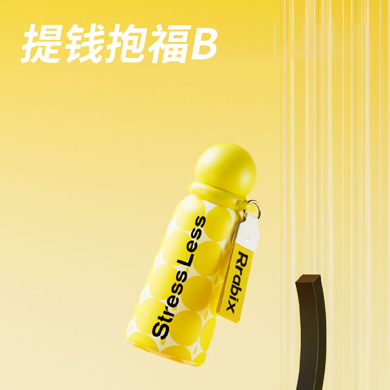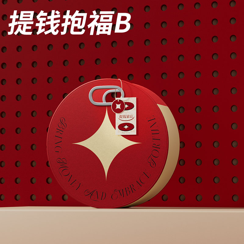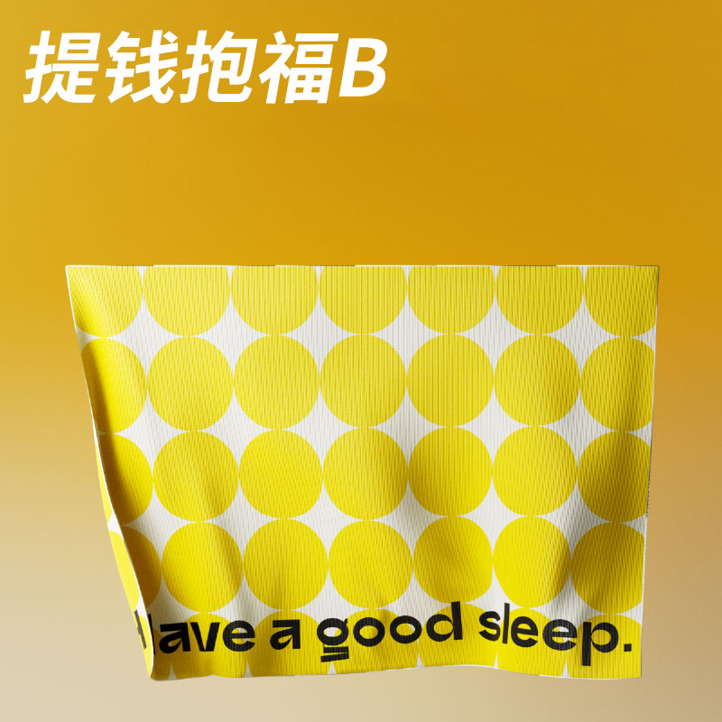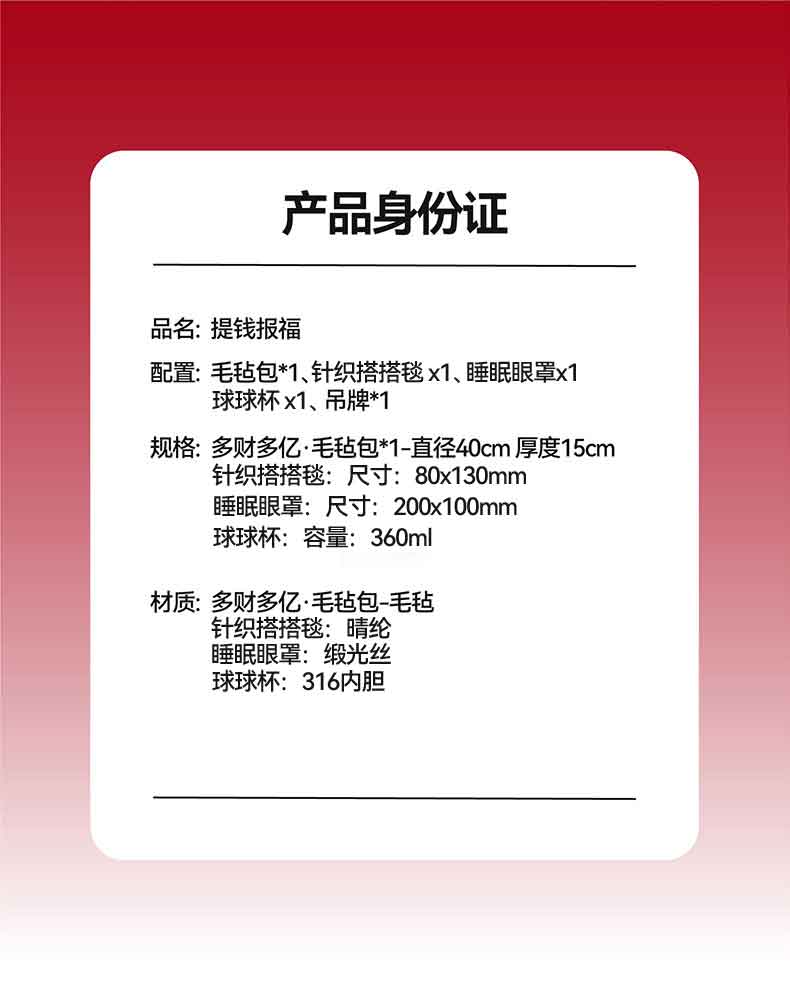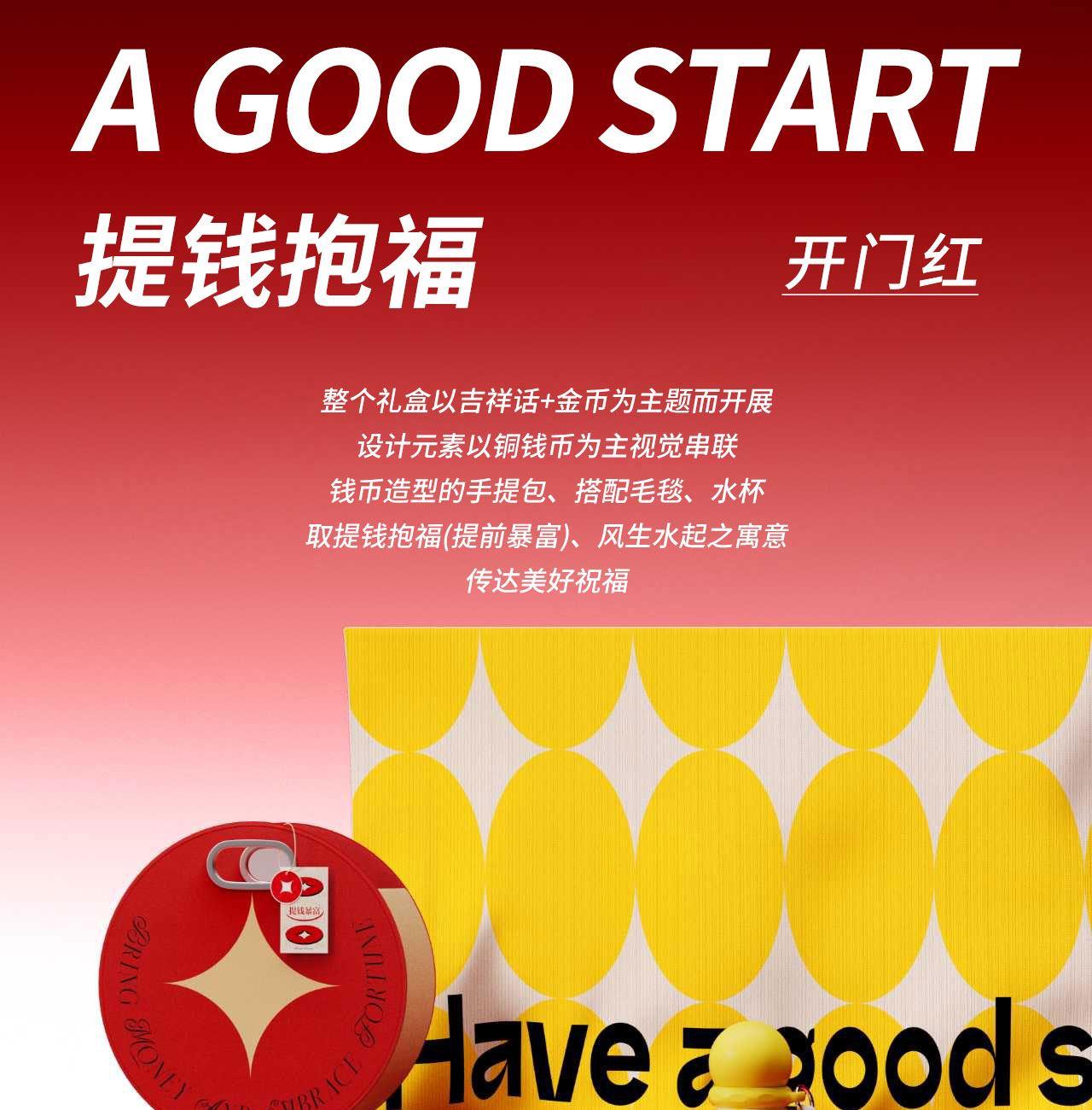 整个礼盒以吉祥话+金币为主题而开展 设计元素以铜钱币为主视觉串联 钱币造型的手提包、搭配抱枕和毛毯、水杯 取提钱抱福(提前暴富)、风生水起之寓意 传达美好祝福 内配:毛毡包*1、针织毯*1 长青兔 ·球球杯*1、眼罩*1