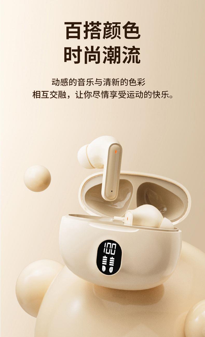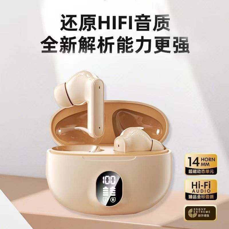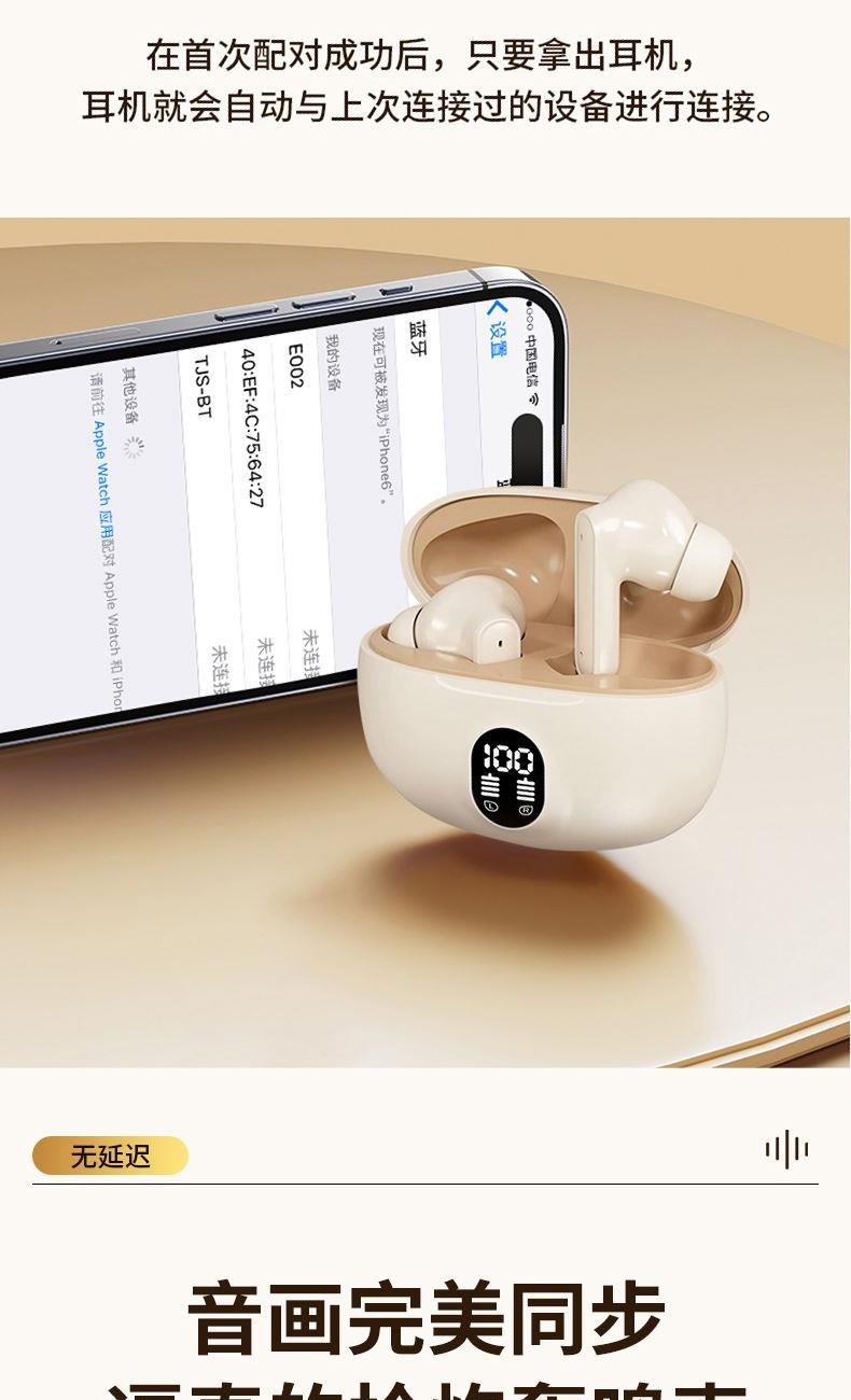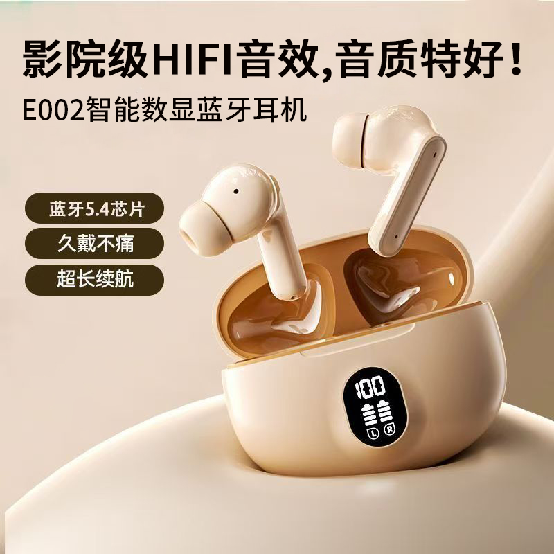 产品型号:E002 产品颜色:肤色 音质等级:高品质HIFI 佩戴方式:入耳式 蓝牙版本:V5.4 传输距离:≥10M 产品材质:ABS+PC 产品尺寸:61mm*48mm*29mm 电仓电池容量:30mAh 耳机电池容量:180mAh 充电电压:DC5V/1A 充电接口:Type-C接口 充电时间:1-2小时 待机时间:30天 通话时长:3-4小时 播放时间:3-4小时 高品质HIFI音效、精致小巧、舒适佩戴、 数显电量、礼盒包装 产品特点:1、精致小巧、携带方便,柔软亲肤硅胶耳帽,佩戴舒适;2、德国专业调音团队,无限调试,适合每一双挑剔的耳朵;3、数显电量,一目了然,掌控电量,畅享无忧;4、低功耗DSP抗干扰Bluetooth5.4芯片,连接顺畅不卡顿;5、ACC+SBC音频解码,无感延迟,音画同步;6、石墨烯振膜,减少失真,双动圈发声,无损音质,畅享中高低音HIFI音效;7、AI通话降噪技术,实现稳定的通话质量;8、安全高标准锂电池,续航更持久;9、生活防水,防水防汗,无惧风雨;10、礼盒包装,支持定制。