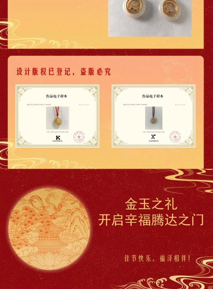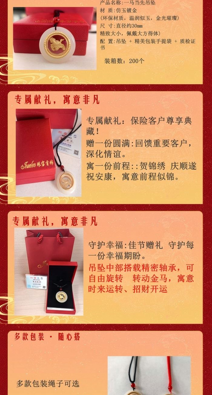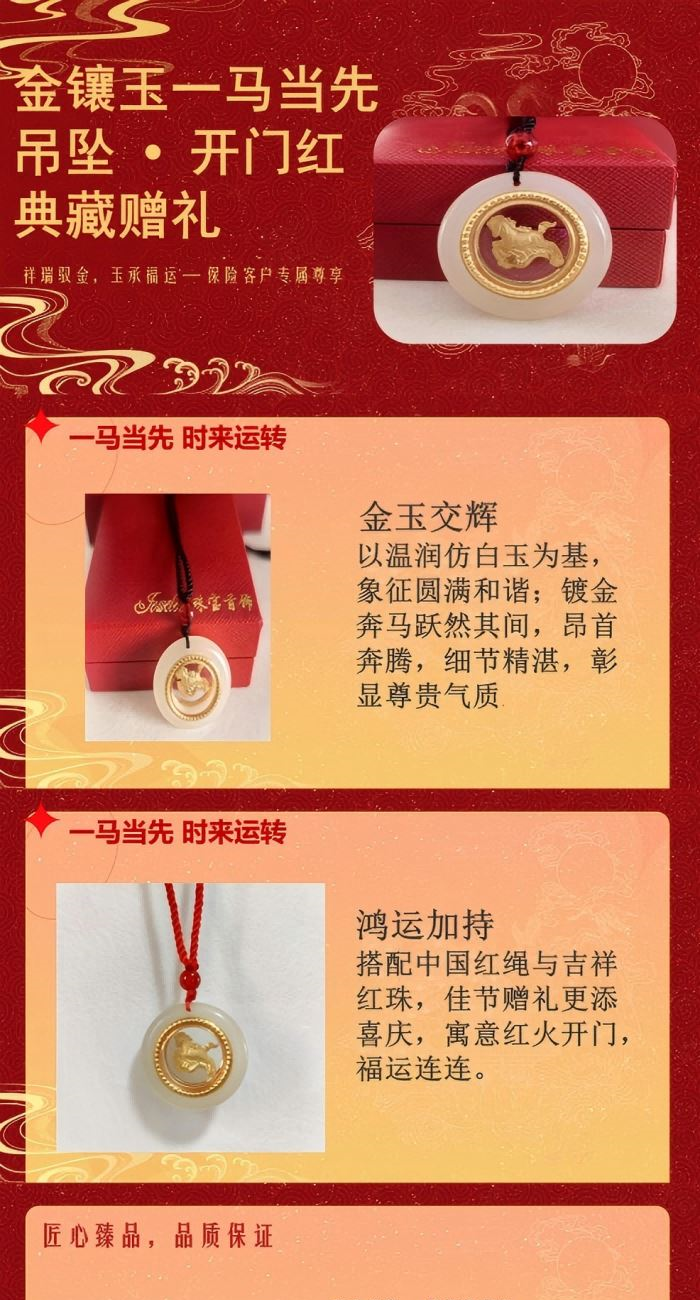 产品材质:仿玉镀金 产品配置:包装礼盒+证书 产品直径:3cm 祥瑞驭金,玉承福运!以温润仿玉为基,镀金奔马跃然其间,寓意人生马到功成! 金玉交辉——玉环象征圆满和谐,金色骏马昂首奔腾,细节精湛,彰显尊贵气质。 鸿运加持——搭配中国红绳与吉祥红珠,佳节赠礼更添喜庆,寓意红火开门,福运连连。 专属献礼:保险客户尊享典藏,赠一份平安,寓一份前程,心意与祝福皆不凡!