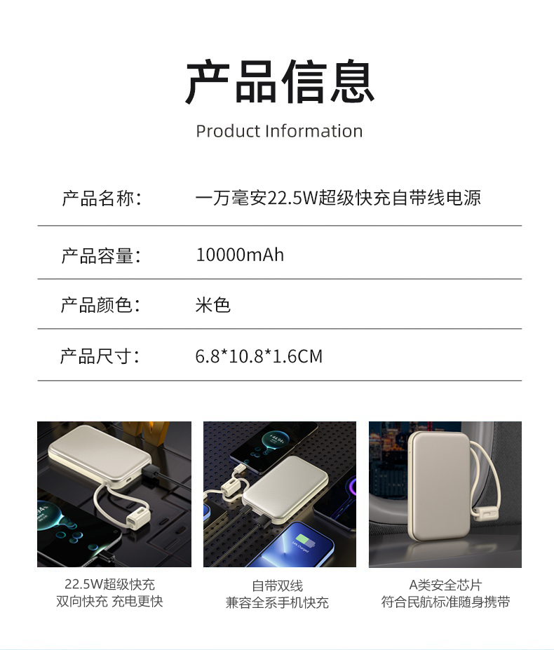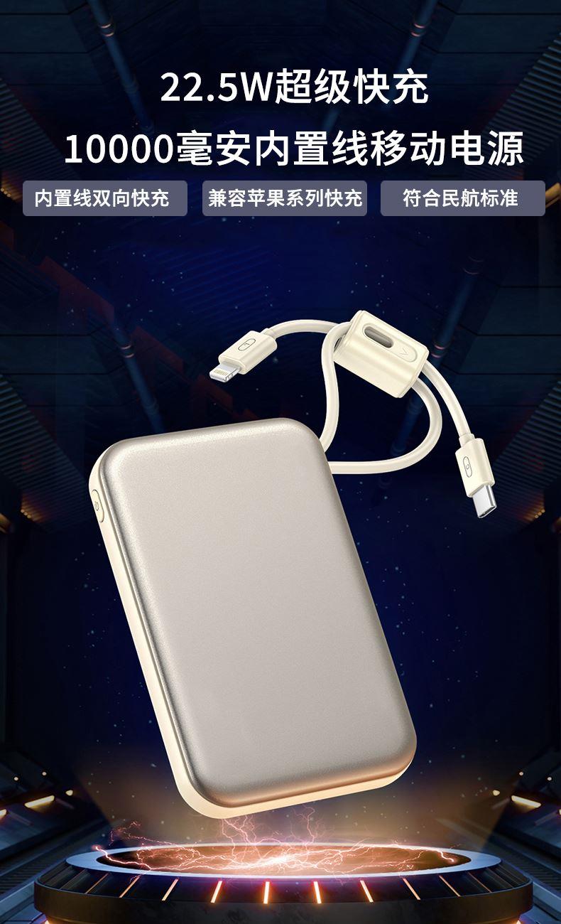 1、一万毫安22.5W超薄铝合金快充移动电源 22.5W超级快充超薄机身 双线快充提绳设计,铝合金面盖 3C符合民航局标准,可随身携带 2、66W铝合金超级快充一拖三伸缩数据线 兼容苹果15系列 五档伸缩调节 1.2米长度设计 铝合金面盖 三种充电接口满足各种手机