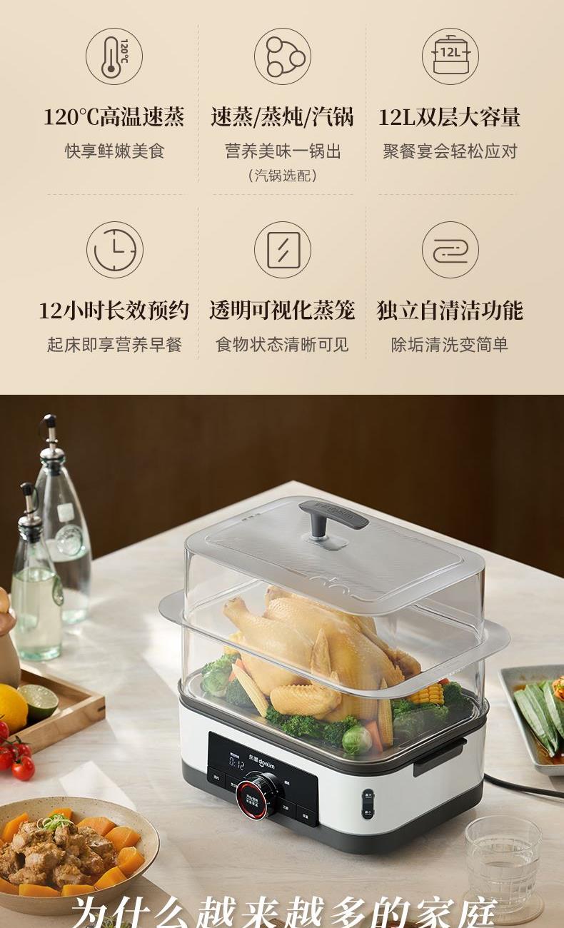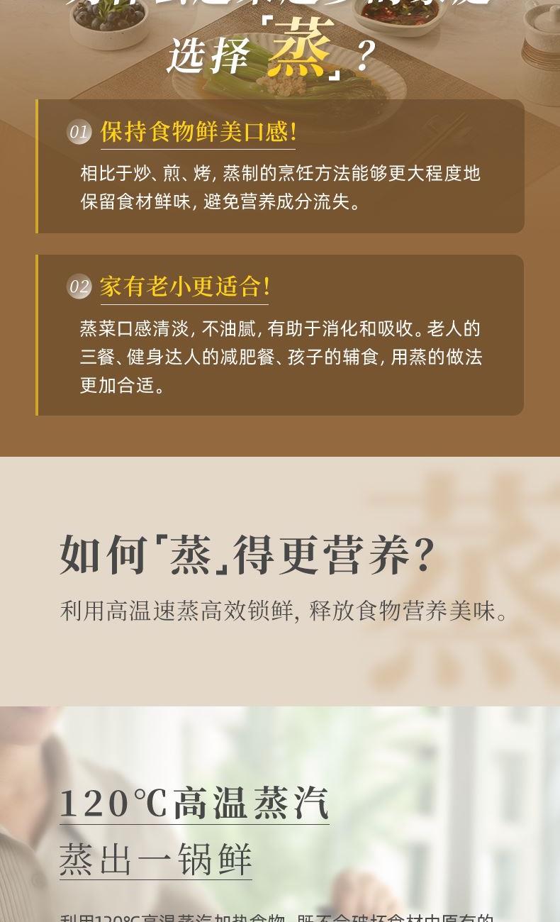 速蒸模式,30秒快出120℃高温蒸汽,高温更锁鲜 透明上盖可观察食物加热状态 12小时智能预约,独立自清洁功能
