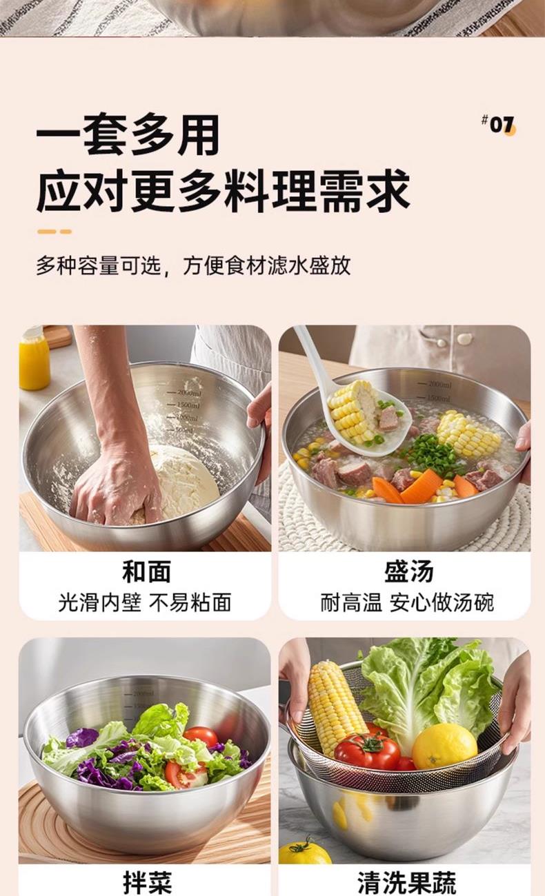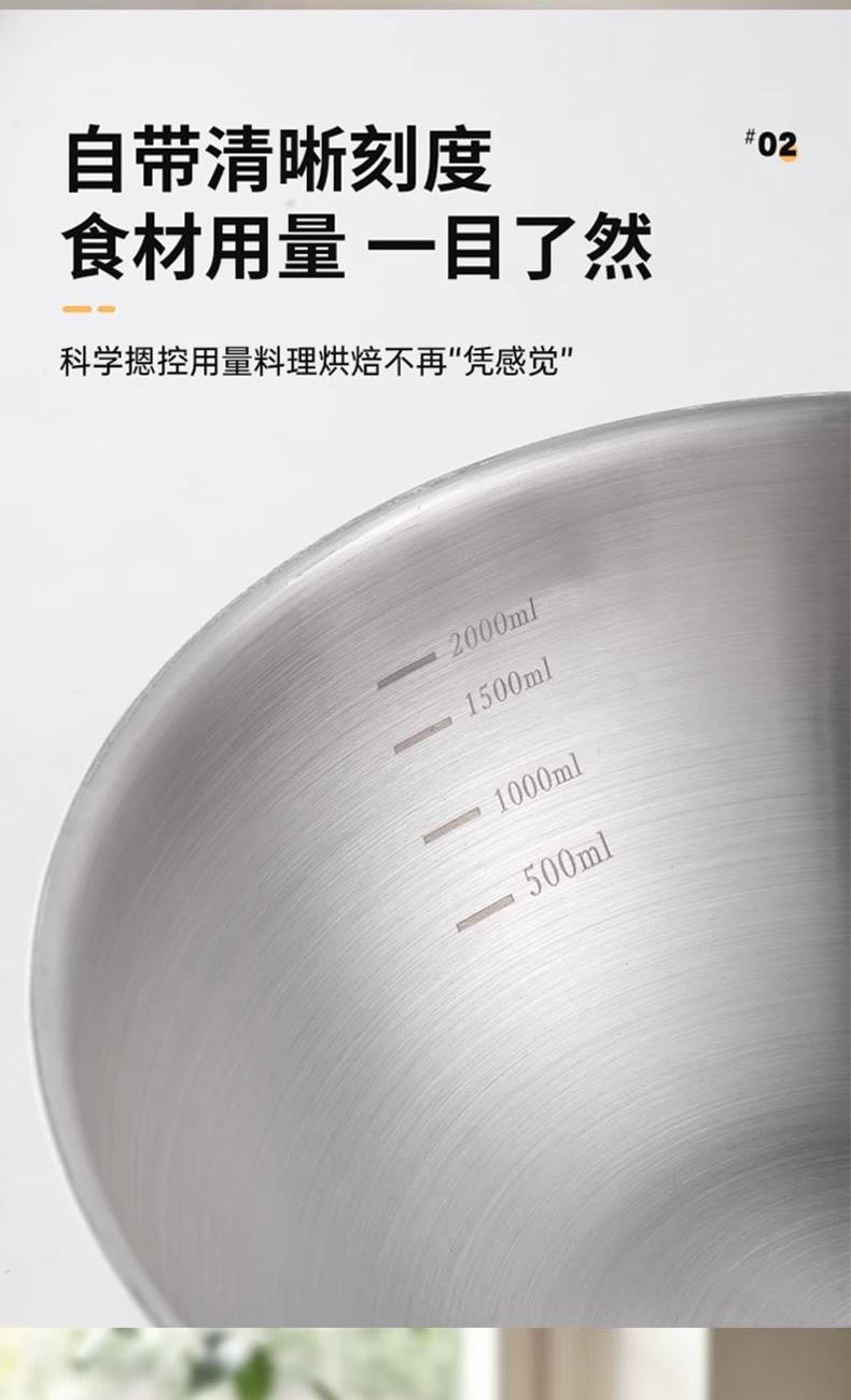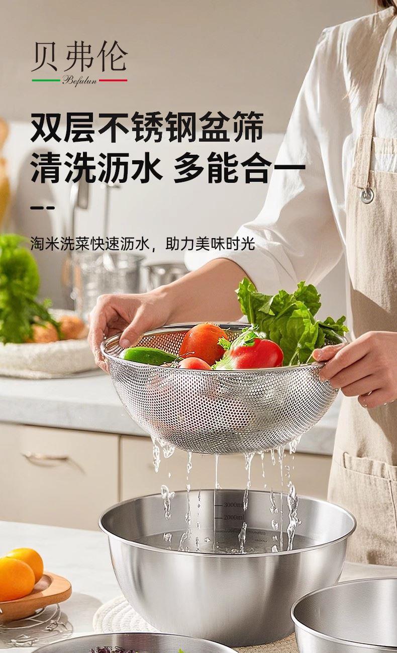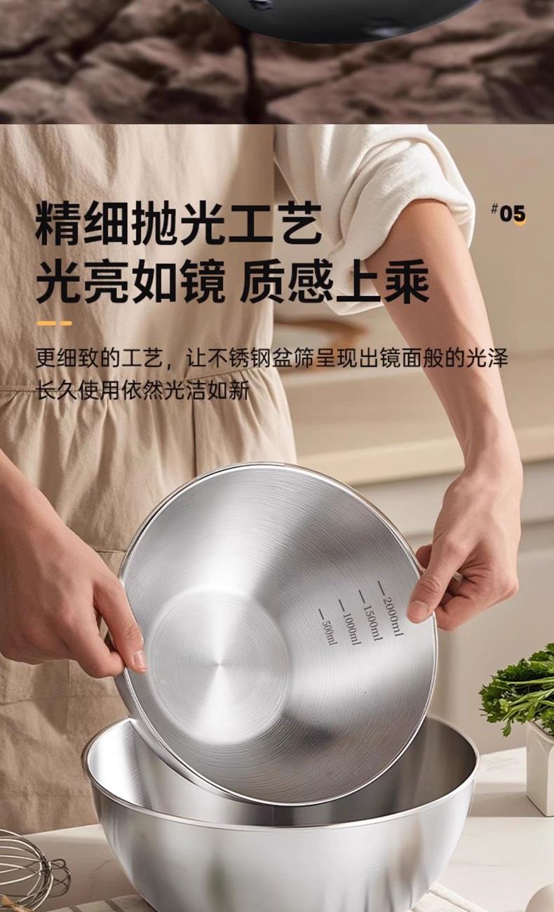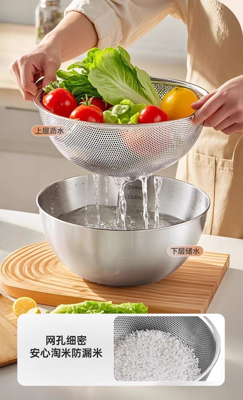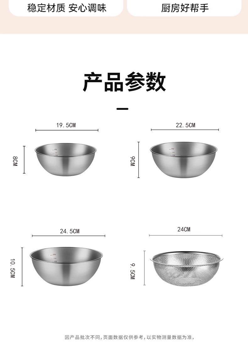 容量:1.5L+2L+3L+3L 材质:奥氏体不锈钢(201) 包装尺寸:25.1*11.7*25.1cm 包装重量:0.96KG 拉丝抛光,易清洁,污渍不残留 加深设计,打蛋和面不飞溅 刻度标识,容量易掌握,控量更科学 清洗沥水,多能合一
