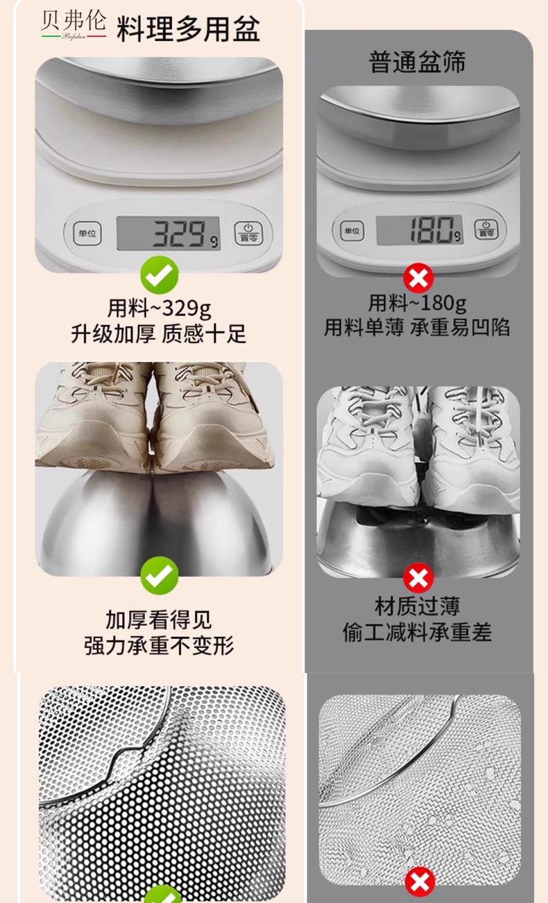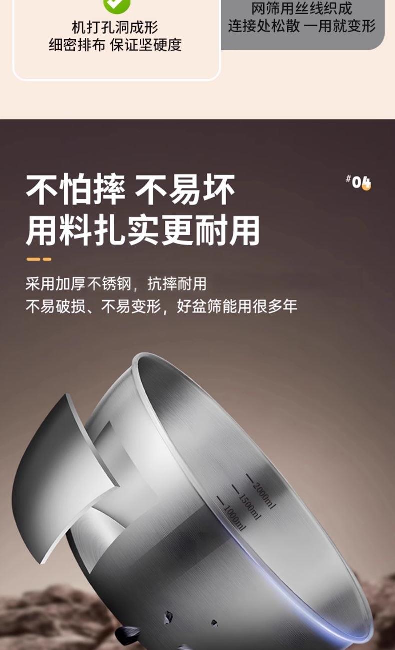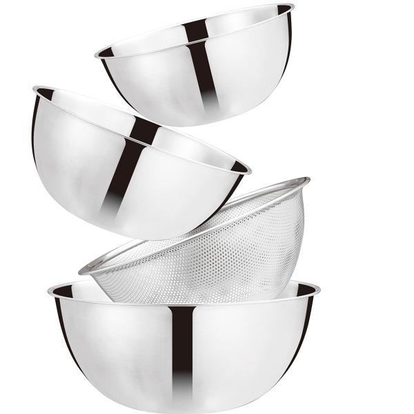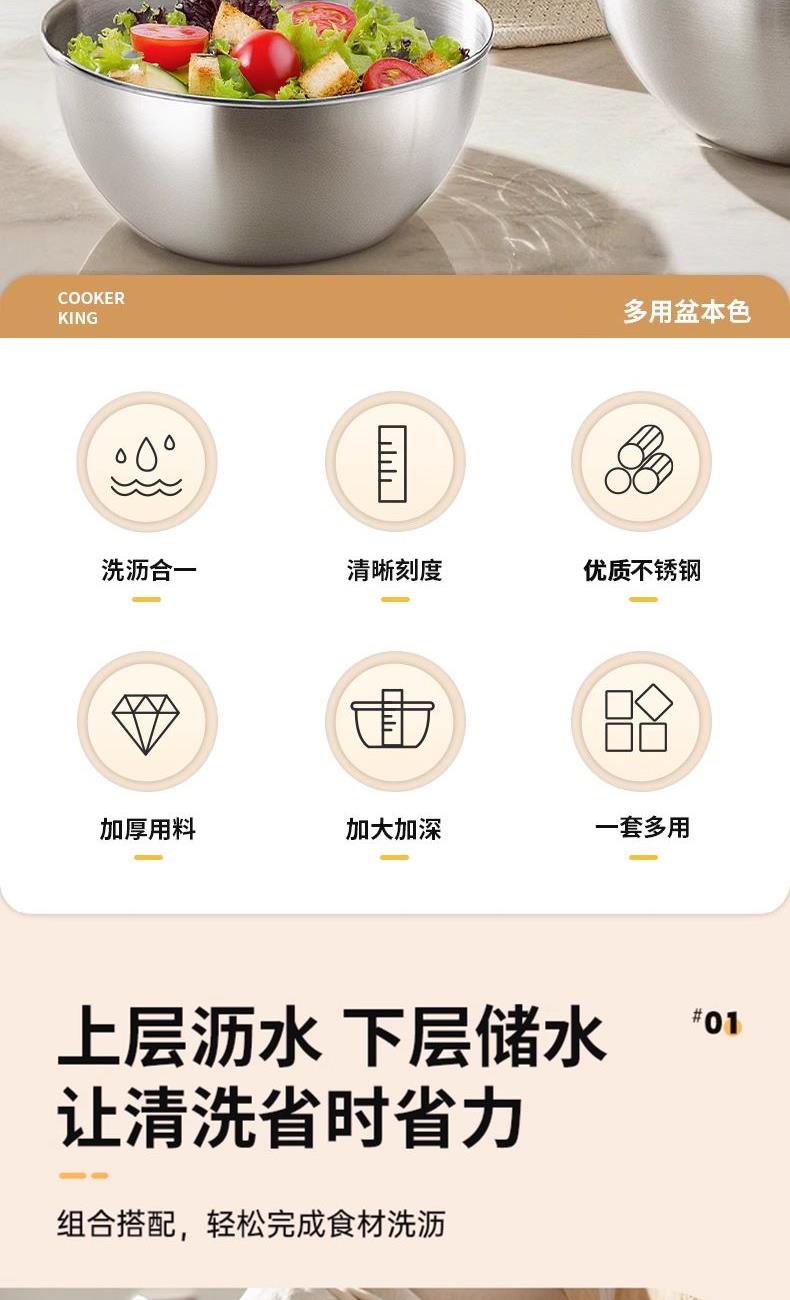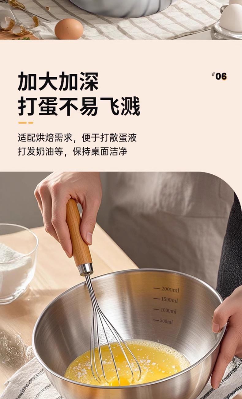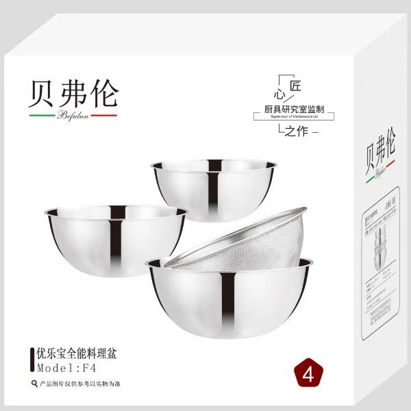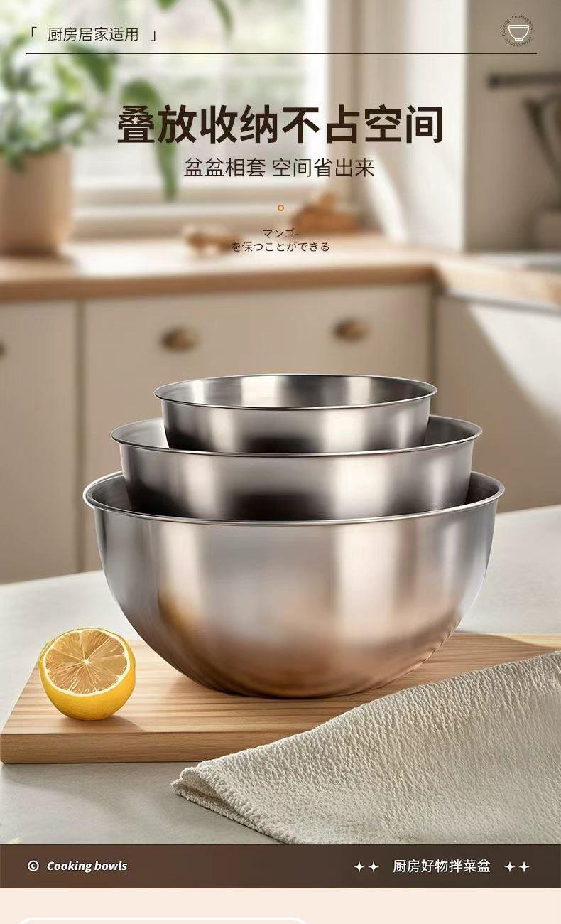 容量:1.5L+2L+3L+3L 材质:奥氏体不锈钢(201) 包装尺寸:25.1*11.7*25.1cm 包装重量:0.96KG 拉丝抛光,易清洁,污渍不残留 加深设计,打蛋和面不飞溅 刻度标识,容量易掌握,控量更科学 清洗沥水,多能合一