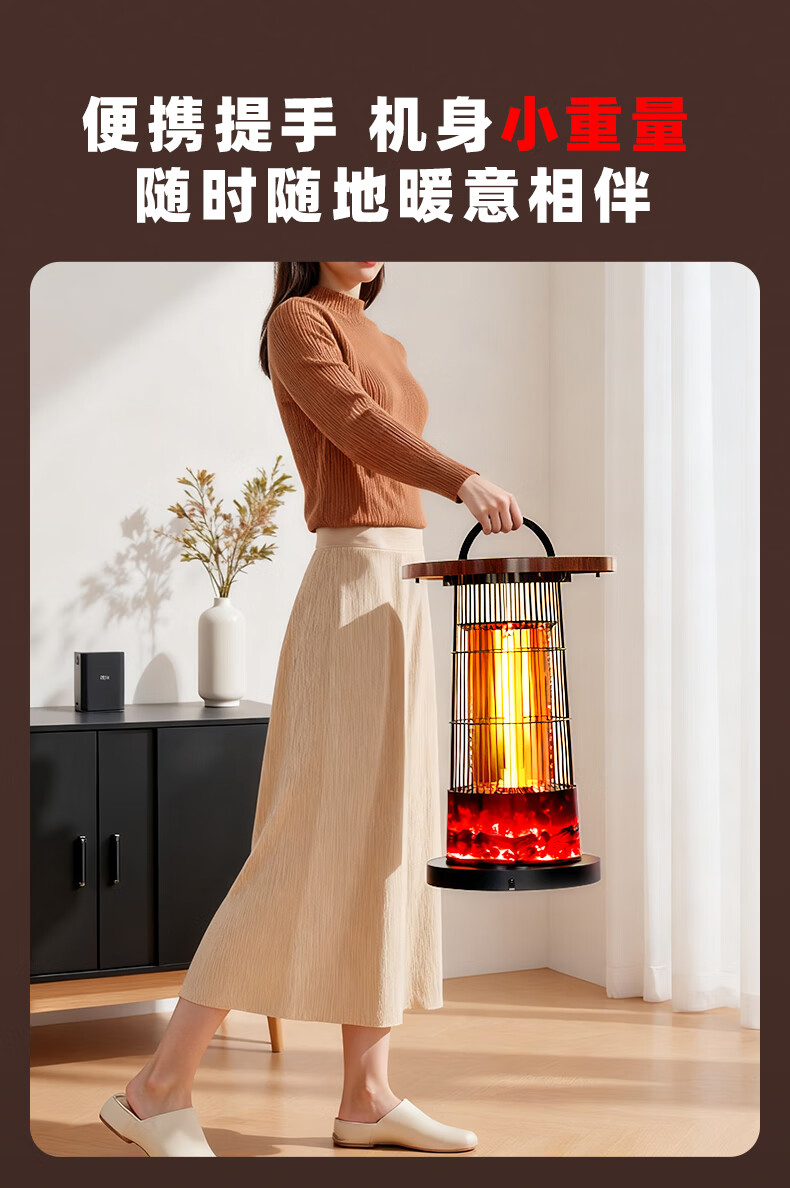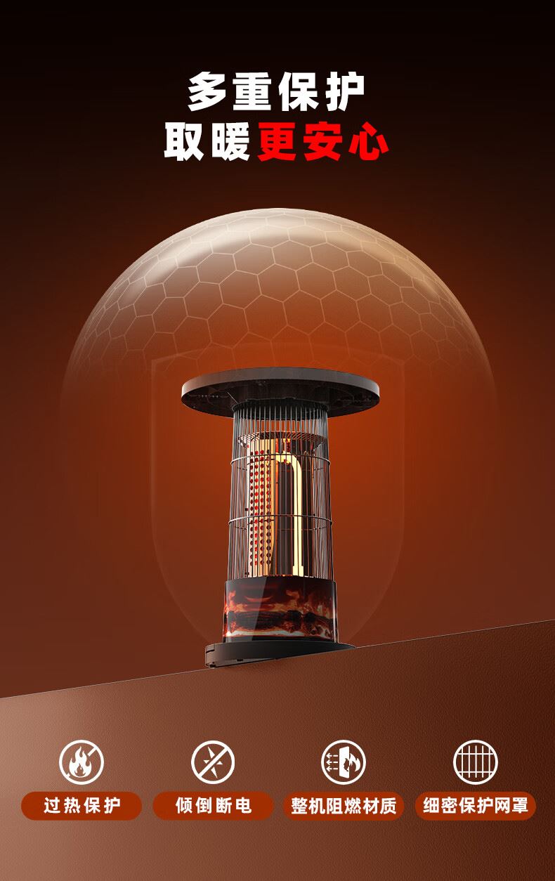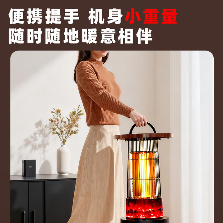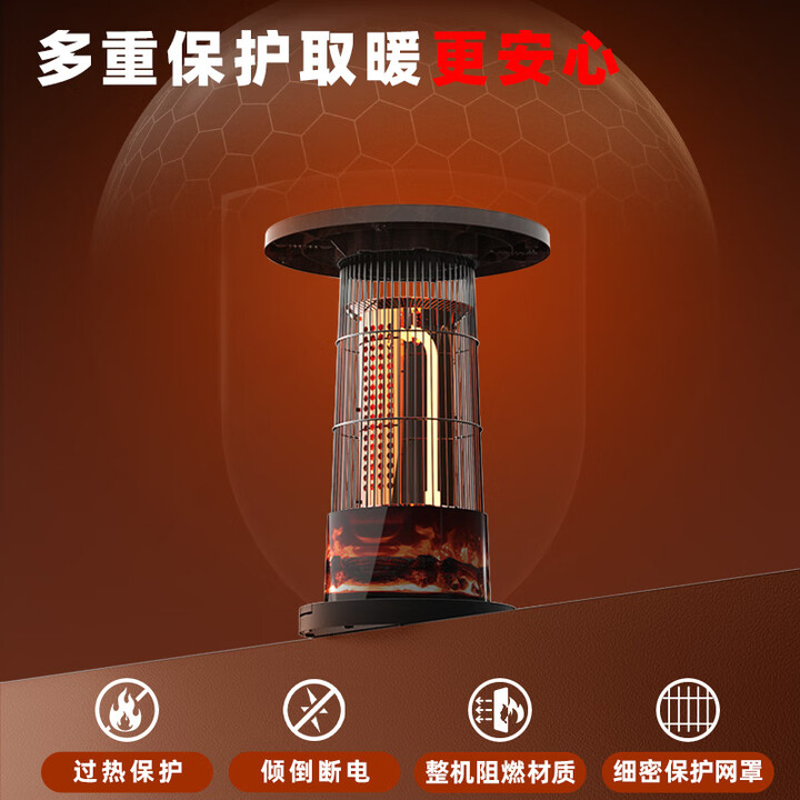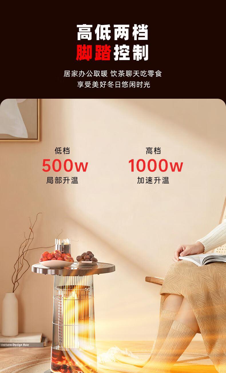 阻燃等级:V-0 倾倒断电,过热保护,外壳防烫设计 适用面积:11-15㎡ 档位:2档 加热方式:碳纤维管加热 控制方式:脚踏控制 额定功率:1000W 额定电压:220V 产品尺寸:260*260*488mm 上下左右暖全身,360度散热 脚踏控制开关,无需弯腰更方便 1000W大功率,快速升温 多重安全保护,取暖更安心 便携提手,机身小重量,随地暖意相伴 仿红木酸枝纹桌板,仿真炭火跳跃,视觉感受冬日温暖